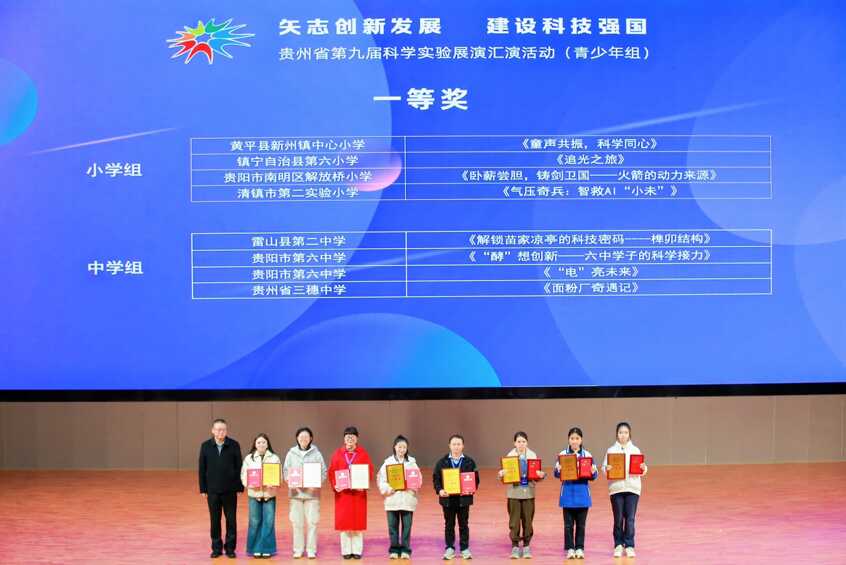 2025年11月1日,贵州省第九届科学实验展演汇演活动(青少年组)决赛在贵阳市第六中学白云校区圆满收官。经过为期两天的激烈角逐,来自黄平县新州镇中心小学、雷山县第二中学等8支代表队荣获一等奖,10支代表队获二等奖,12支代表队获三等奖,其余参赛队伍获得优秀奖。同时,对在预赛组织工作中表现突出的单位予以“优秀组织单位”称号。
