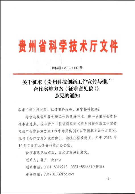 关于征求《贵州科技创新工作宣传与推广合作实施方案(征求意见稿)》意见的通知