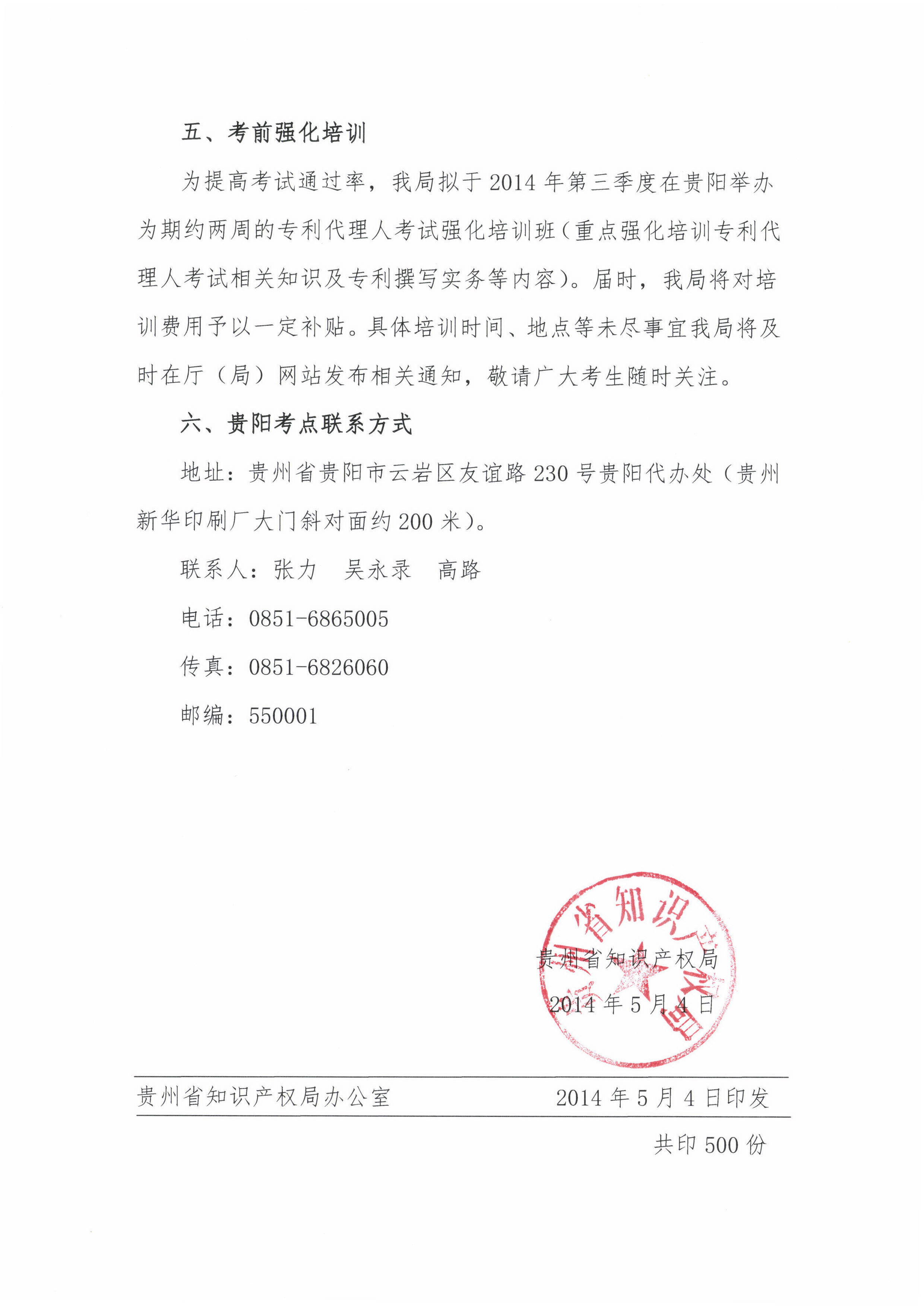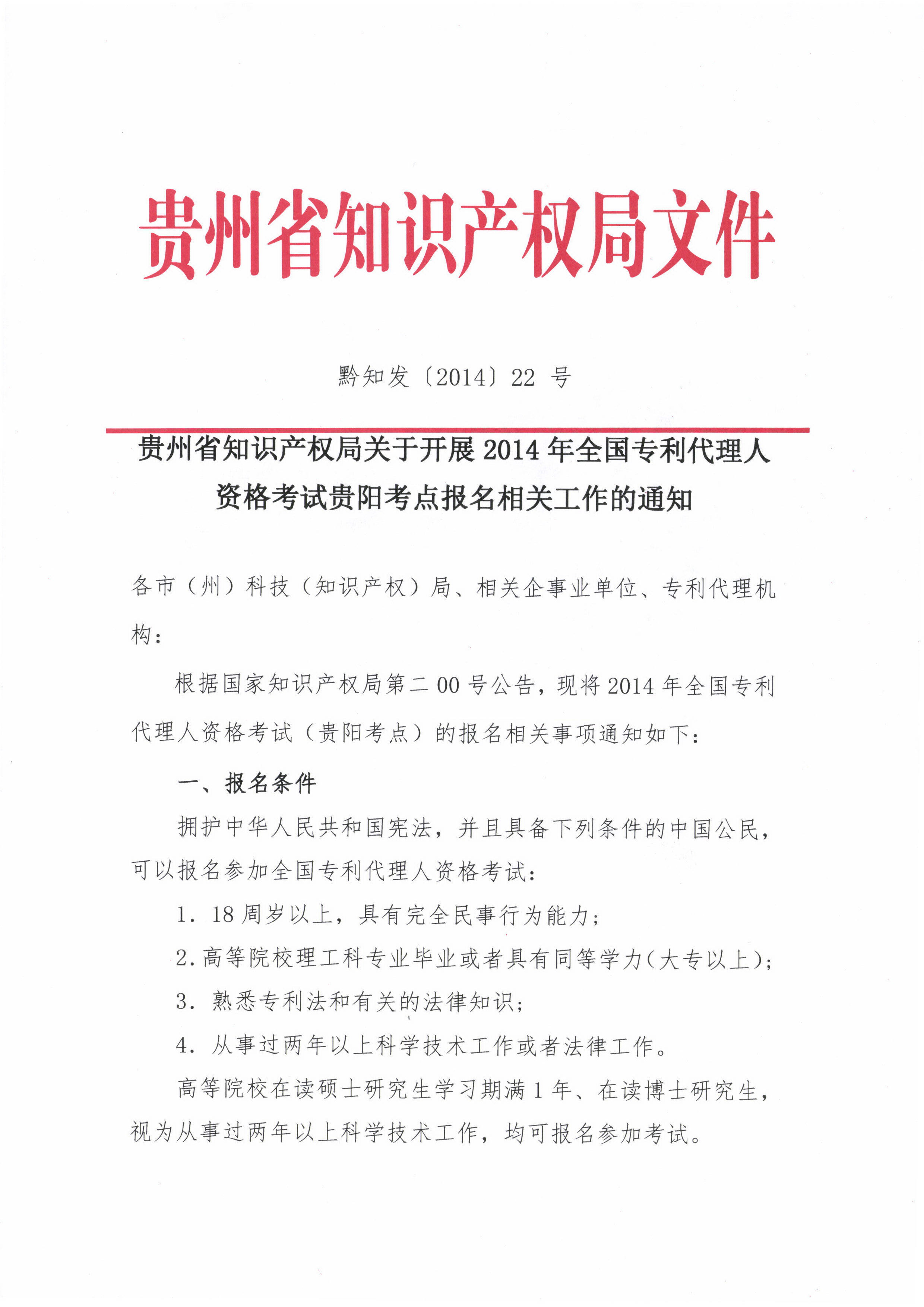 贵州省知识产权局关于开展2014年全国专利代理人资格考试贵阳考点报名相关工作的通知