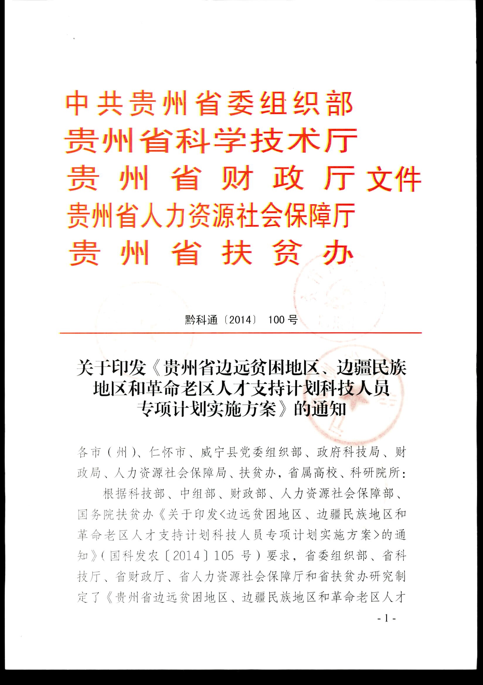 关于印发《贵州省边远贫困地区、边疆民族地区和革命老区人才支持计划科技人员专项计划实施方案》的通知