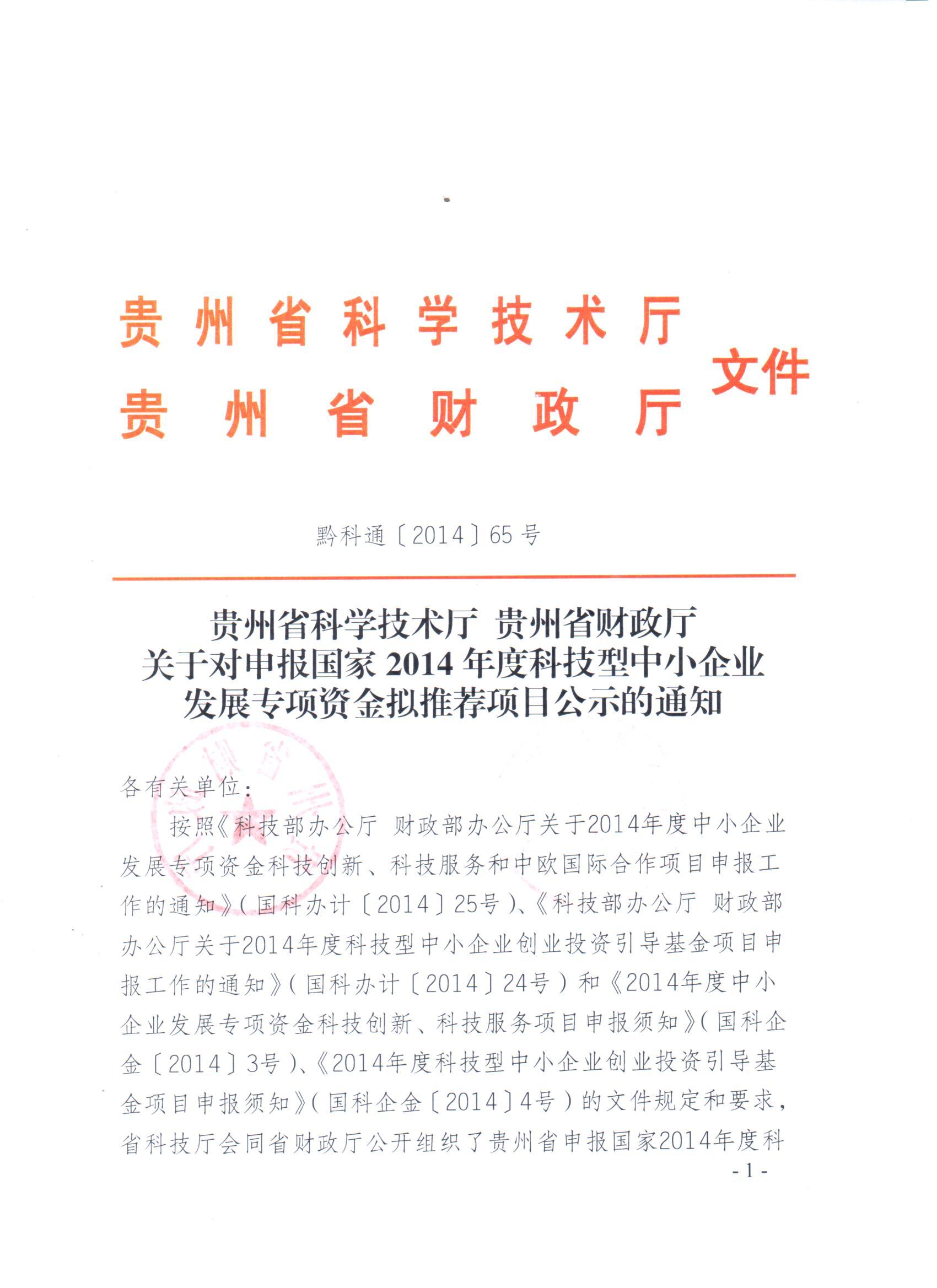 365买球(中国)官方网站 贵州省财政厅 关于对申报国家2014年度科技型中小企业发展专项资金拟推荐项目公示的通知